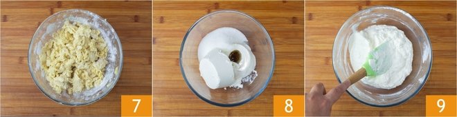 Continue with your hands until you get large crumbs and set aside 7. Move on to the filling: in a bowl, put the sugar, ricotta, and vanilla extract 8, then work with the spatula; the result should be a homogeneous cream 9.