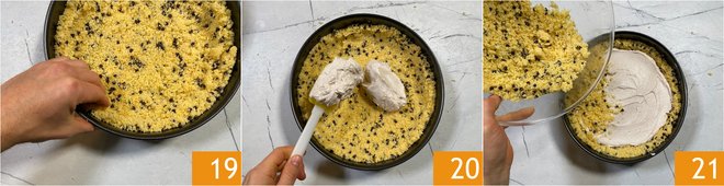 Do the same to create the edges 19. Pour the ricotta cream in the center 20 and level it, then add the remaining shortcrust crumbs 21.
