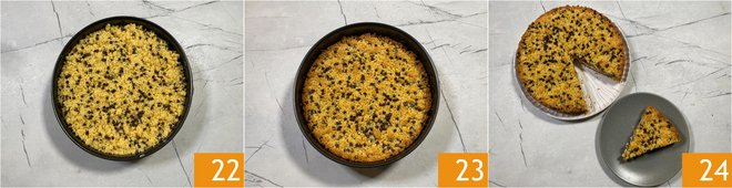 Once ready 22, bake in a preheated static oven at 390°F for 25 minutes on the middle rack, then move it to the bottom rack and continue baking for another 10-15 minutes 23. Once the baking time is up, remove from the oven and let cool in the pan before unmolding 23. Your crumbled ricotta and chocolate cake is ready to be enjoyed 24!