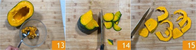 Remove the seeds and inner fibers 13, then peel it 14 and cut the flesh into slices about 0.8 inches thick 15.
