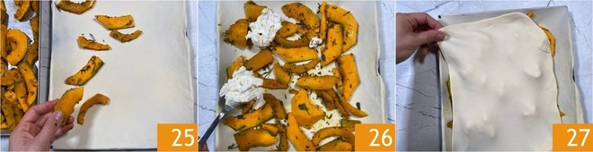 Spread the cooled pumpkin on the focaccia base 25, then add the stracchino by spoonfuls 26. Roll out the 10.58 oz portion of dough the same way and use the obtained sheet to cover the focaccia 27.