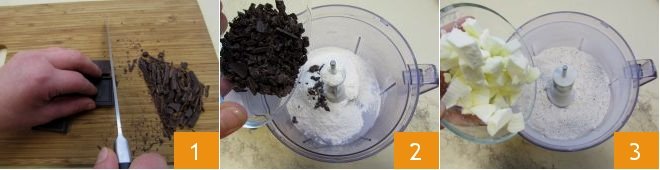 To prepare crunchy stars with chocolate and cinnamon, start by chopping the dark chocolate 1, then add it to the sifted flour in the bowl of a mixer 2. Also pour in the cold butter cut into pieces 3;
