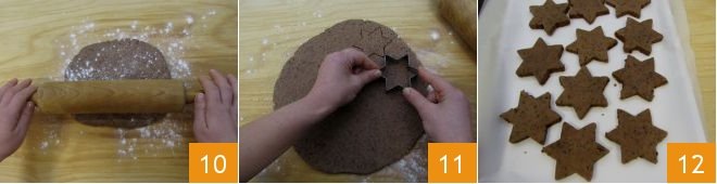 After the necessary time, roll out the dough on a lightly floured work surface to a thickness of about 0.4 inches 10. Using a star-shaped cookie cutter, cut out shapes from the dough 11: you will get about 26; you can knead the scraps to finish the dough. Place them on a tray lined with parchment paper and refrigerate to firm up for 15 minutes.