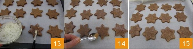 Then place them on a baking sheet lined with parchment paper and brush them with egg white 13, then sprinkle with sugar flavored with ground cinnamon 14 and bake at 302°F for about 12-15 minutes (266°F for 8-10 minutes if using a fan oven. You can bake 1 or 2 as a test to better adjust the time and temperature). Once baked, remove the crunchy chocolate and cinnamon stars 15 and let them cool completely on a rack before serving!