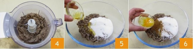 then operate the blades to create a sandy mixture 4. Transfer it to a bowl and pour in the granulated sugar and honey 5. Then add the egg yolk 6. Also add the ground cinnamon and grated lemon zest.