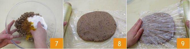 Quickly work all the ingredients by hand to avoid warming the dough too much 7, then form a dough ball, flatten it into an oval shape, and wrap it in plastic wrap (8-9). Place it in the refrigerator for at least 30 minutes to firm up.