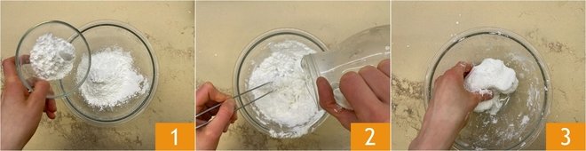 To prepare the crystal dumplings, start with the dough: in a bowl, pour the wheat starch and cornstarch 1. Mix the powders with chopsticks (or a spoon), then slowly pour in the boiling water 2. Once all the water is absorbed, knead by hand 3.