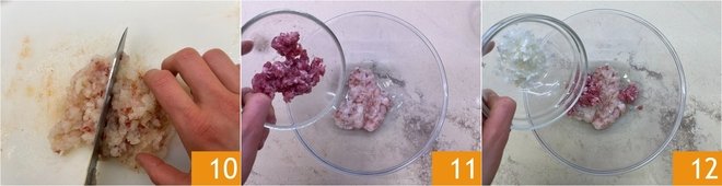 You should obtain a very fine mince 10. Transfer the shrimp to a bowl, then add the ground pork 11 and half a chopped scallion 12.