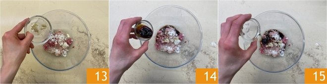 Now season with grated ginger 13, soy sauce, oyster sauce 14, and sesame oil 15.