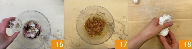Also add some ground white pepper 16 and a pinch of salt. Mix well to combine the filling 17. Now take the dough to form the dumplings: take pieces weighing about 20 g (0.7 oz) for each dumpling 18. Cover the rest of the dough with plastic wrap to prevent it from drying out.