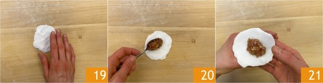 Roll out the dough ball by applying light pressure with the side of your palm: the disc should be thinner at the edges so that the thicker center won't crack during cooking. Lift the disc from the work surface with a scraper, then fill the center with a teaspoon of filling 20. Fold it in half, aligning the two edges 21.