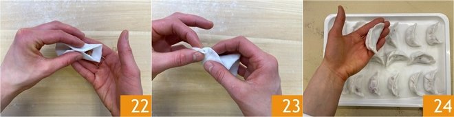 Pinch the edges firmly at the center 22, then close the dumplings, slightly pleating the edges as you seal 23, to create a wavy pattern 24. With these quantities, you'll get about 16 dumplings.