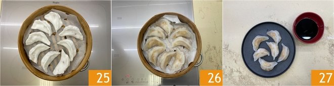 Prepare the steamer basket, line it with a sheet of parchment paper with small holes, and place the dumplings 25. Cover with the appropriate lid and steam for 8-10 minutes 26. Serve your crystal dumplings with soy sauce 27!
