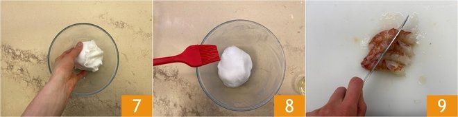 Form the dough into a ball again, place it back in the bowl 7, and brush the surface with sesame oil to keep it hydrated 8. Cover with plastic wrap and set aside while you prepare the filling. Finely chop the cleaned shrimp with a knife 9.