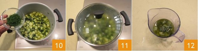 Add the dill 10 and cover with a lid 11. Let it simmer gently for about 20-25 minutes. After this time, turn off the heat and let it cool slightly. Transfer to a high-sided container 12.