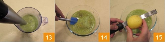 Blend with an immersion blender until you get a smooth cream 13. Pour the cream into a large bowl, adjust with salt and pepper 14, and grate in some untreated lemon zest 15.