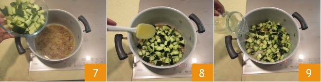 Add the cucumber cubes 7 and cook them for a few minutes, stirring with a spatula 8. Now, add the hot vegetable broth 9.