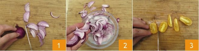 To prepare the cucumber salad, first clean the spring onions and cut them into very thin slices 1, then transfer them to a bowl filled with ice water 2: this way they will have a less pungent flavor and remain crispy. Wash and quarter the yellow cherry tomatoes 3