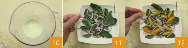 Blend with an immersion blender until you get a smooth and homogeneous sauce 10. At this point, you can assemble the salad: arrange the baby spinach leaves on a plate, add the drained spring onions 11 and the colored cherry tomatoes 12.