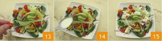 Complete the dish by arranging the cucumber strips in a nest shape 13 and dressing with the yogurt dressing 14: your cucumber salad is ready to be enjoyed 15!