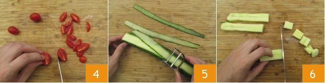 and the red cherry tomatoes 4. Now wash the cucumbers and cut long, thin strips using a vegetable peeler 5; once you reach the seed-filled center, turn the cucumber and cut slices from the opposite side as well. Finally, cut the remaining cucumber core into cubes 6. You will need about 3.5 oz of cucumber strips for the salad and 5.3 oz of cucumber cubes for the dressing.