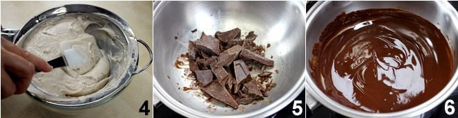 Pass the puree through a sieve to eliminate lumps or any traces of chestnut skin 4 to obtain a creamy mixture. Place the chocolate pieces in a bain-marie 5, melt them and add the cubed butter, stirring until smooth 6;