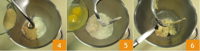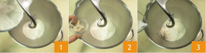 To prepare the Danubio with Nutella, start by pouring the all-purpose flour and bread flour into the bowl of a stand mixer with a hook attachment 1, add the crumbled fresh yeast 2, and milk at room temperature 3.