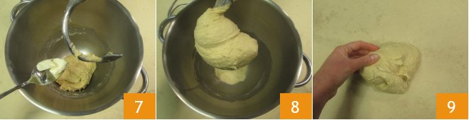 Now it's time for the butter, added one piece at a time at room temperature 7. Don't rush this stage and let the mixer work until the dough is well kneaded, meaning it clings to the hook 8. Pour the dough onto the work surface and knead briefly by hand 9.