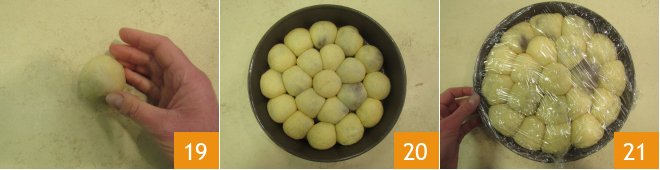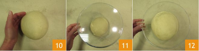 Form a ball 10 and place the dough in a bowl, cover with cling film 11. Let it rise for a couple of hours at room temperature (the ideal temperature is 77/81°F) or until the dough doubles in size 12.