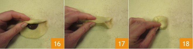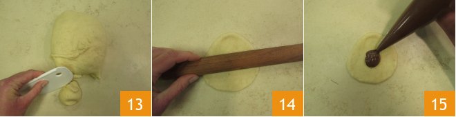 After the resting time, detach the dough from the bowl and divide it into 20 pieces weighing 1.25 oz each using a dough scraper 13. Flatten with a rolling pin 14 and, using a piping bag, fill the center with 0.35 oz of Nutella 15.