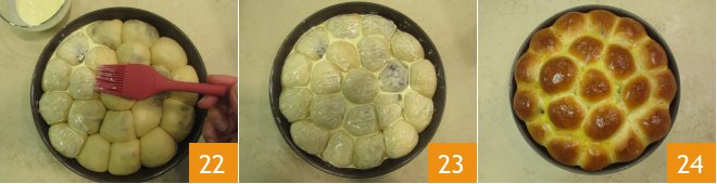 After the time has passed, brush the surface with beaten eggs and cream together 22 and proceed to baking 23: Danubio with Nutella bakes in a preheated static oven at 356°F for about 30 minutes. Let cool before serving 24.