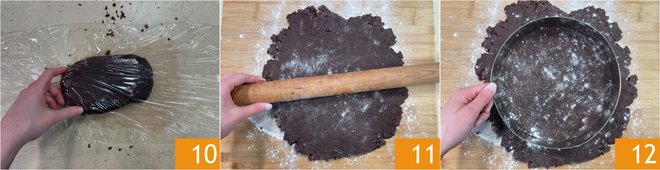 Form a dough, wrap it in plastic wrap 10, and place it in the fridge for 1 hour. Take the base and roll it out with a rolling pin to a thickness of about 1/8 inch 11, cut it with a 9-inch ring 12.