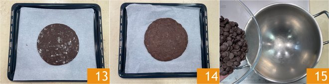 Transfer the disc to a baking tray lined with parchment paper 13, bake in a static oven preheated to 329°F for 20 minutes 14. Prepare the mousse: melt the dark chocolate in a double boiler 15.