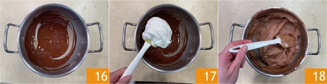 When it has reached a temperature of 113°F 16, pour in the semi-whipped cream 17 all at once, mix first with the whisk and then with the spatula 18.