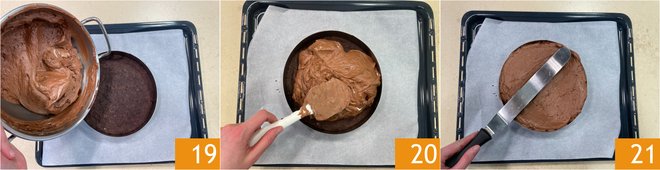 Place the ring back on the sable base, so that the cake maintains its shape, then pour the mousse 19, distribute it evenly 20, then level it with the spatula 21. Transfer to the fridge for two hours.