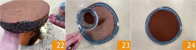 Retrieve the set cake, remove the ring and cover it laterally with chocolate flakes 22. Dust the surface with cocoa powder 23 and your dark chocolate mousse cake on sable base is ready to be enjoyed 24.