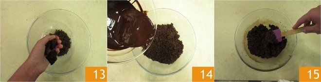 Break the crumble into pieces in a bowl 13, add the oil and chocolate mixture 14, and mix with a spatula 15.