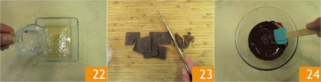 Meanwhile, soak the gelatin in cold water 22. Coarsely chop the chocolate 23 and melt it in the microwave or a double boiler 24.