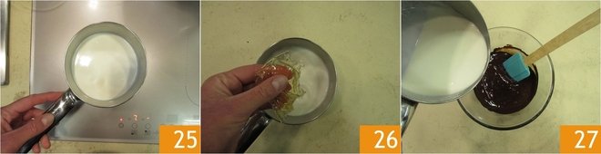 Heat the cream in a small pot 25, and as soon as it comes to a boil, add the drained gelatin 26. Stir well to dissolve it 26, then add it to the mixture in 3 batches 27.