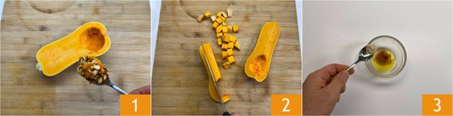 To prepare diced pumpkin in an air fryer, first remove any seeds and internal fibers 1. Also, remove the stem and, without peeling, cut it into cubes about 0.6 inches 2. In a small bowl, pour the oil, the tip of a teaspoon of paprika, and the same amount of garlic powder 3.