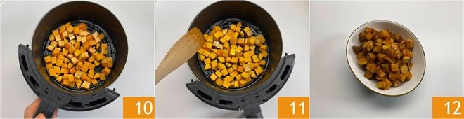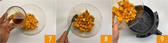 Use this emulsion to season the pumpkin in a bowl 7, mixing well 8. Then transfer the pumpkin to the air fryer's basket (we used a fryer with a 6-liter capacity) 9.