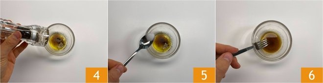 Add ground black pepper 4, a generous pinch of fine salt 5, and emulsify with a fork 6.