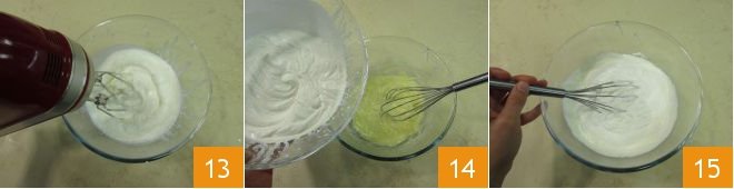 In the meantime, half-whip the cream 13. It should be soft, shiny and not too whipped. Take the custard from the fridge and add 1/3 of the whipped cream 14. Whip the mixture quickly 15.