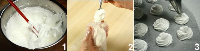 Preheat the oven (preferably with a fan) to 176°F. In a large bowl, whip the egg whites until stiff (even better if you use a mixer), then add the sugar, vanilla bean seeds, and beat everything for 10 minutes, until you get a thick and frothy mixture 1 with which you will fill a pastry bag with a star tip 2.