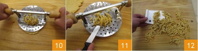 Once the dough has rested, remove the plastic wrap and place it on a lightly floured work surface. Dust also the surface with a little flour and then form the passatelli using the typical iron. To make them, you need to press and drag at the same time 10, this way the extended dough will come out through the holes. Cut them one by one using a blade and cut them into 1.5-inch long pieces 12, and place them on a lightly floured board or tray. Complete with all the dough this way.