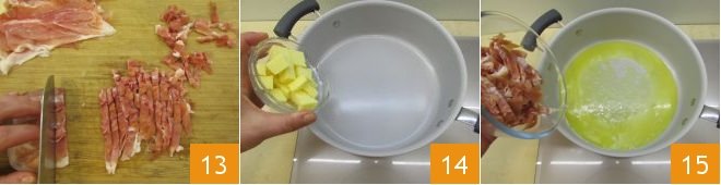 At this point, strain the broth and keep it warm; then prepare the sauce. Cut the prosciutto into strips 13 about 0.4 inches wide, place the butter in a pan 14, wait until it is completely melted, and add the prosciutto strips 15.
