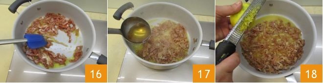 Sauté the prosciutto for a couple of minutes over high heat 16, then add a ladle of broth 17, a bit more lemon zest 18, and turn off the heat.