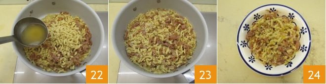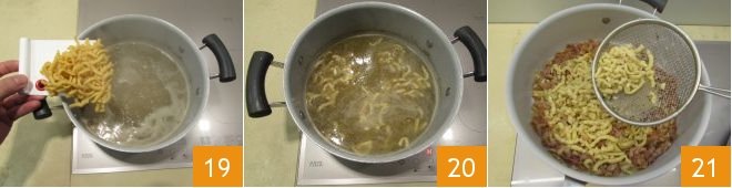 Cook a few passatelli at a time in the boiling broth 19 until they float to the surface 20. At this point, using a slotted spoon, remove them from the broth and place them directly into the pan with the prosciutto-based sauce 21. Finish cooking the passatelli and gradually stir to combine them with the sauce.