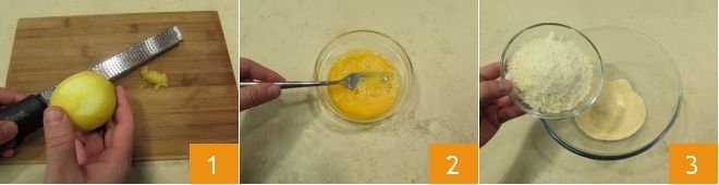 To prepare dry passatelli, start by making the Beef Broth. While it is cooking, prepare the dough for your passatelli. First, grate the zest of half a lemon 1, then crack and beat the eggs in a small bowl 2. In a larger bowl, combine the breadcrumbs and the Parmesan cheese 3;