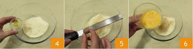 add the zest of half a lemon 4 and a generous grating of nutmeg 5. Also add the eggs 6